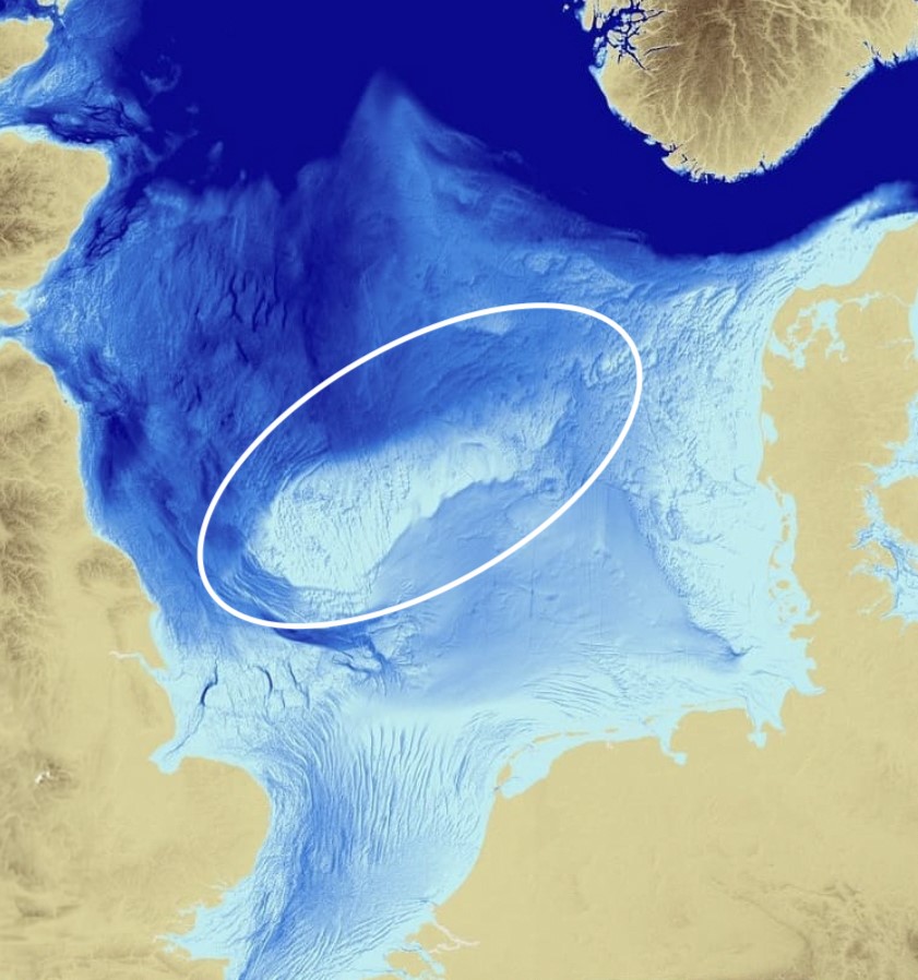 De Doggersbank – afgebeeld binnen het witte ovaal – was het laatste bolwerk van onze voorouders toen hun uitgestrekte Doggerland duizenden jaren geleden onder water liep. Het was een gebied van ijs, toendra, rivieren, veenmoerassen en is nu een ondergelopen zandbank in het hart van de Noordzee.